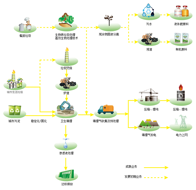蔚蓝生态环境科技所从事的市政废物处理业务包括市政废物的处理处置和再生能源利用,主要是对城市生活垃圾进行清运和卫生填埋以及生活垃圾填埋渗滤液进行处理达标排放;对市政污水处理过程中产生的污泥进行稳定化/固化改性填埋;对建筑废弃物和餐厨垃圾进行处理及综合利用;利用生活垃圾填埋场所产生的填埋气进行发电。此外,填埋气发电项目和公司联合投资的煤矿乏风减排项目可减少温室气体的排放,符合《京都议定书》规定的清洁发展机制,项目经联合国CDM执行理事会批准后,二氧化碳核准减排量可在国际市场交易。